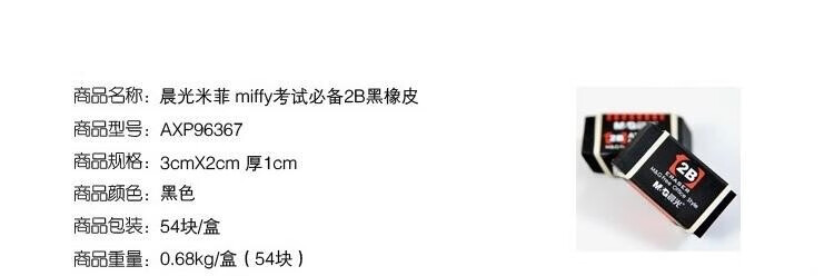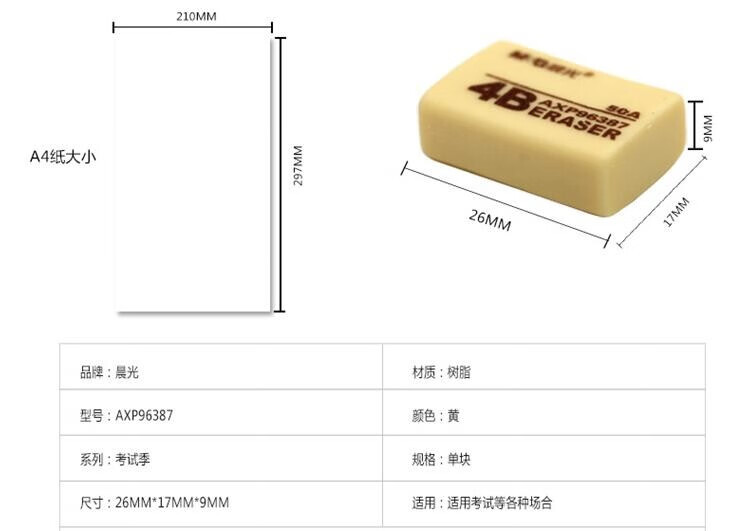商品名称:晨光考试橡皮擦 美术绘图橡皮擦 素描橡皮 学生橡皮 2B/4B/6B 多款可选 颜色随机 96367 2B橡皮 2块 商品编号:48661638344 品牌:Signal Amplifier 上架时间: 商品毛重:0克