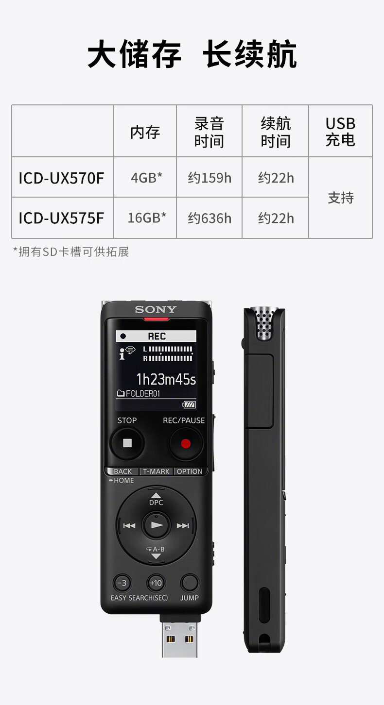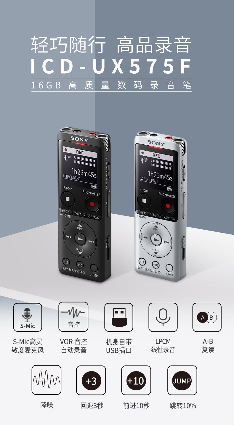 - 商品名称:索尼(SONY) ICD-UX575F录音笔16GB大容量智能降噪升级 商务学习专业线性录音棒赠转写 黑色 16GB大容量 VOR音控录音