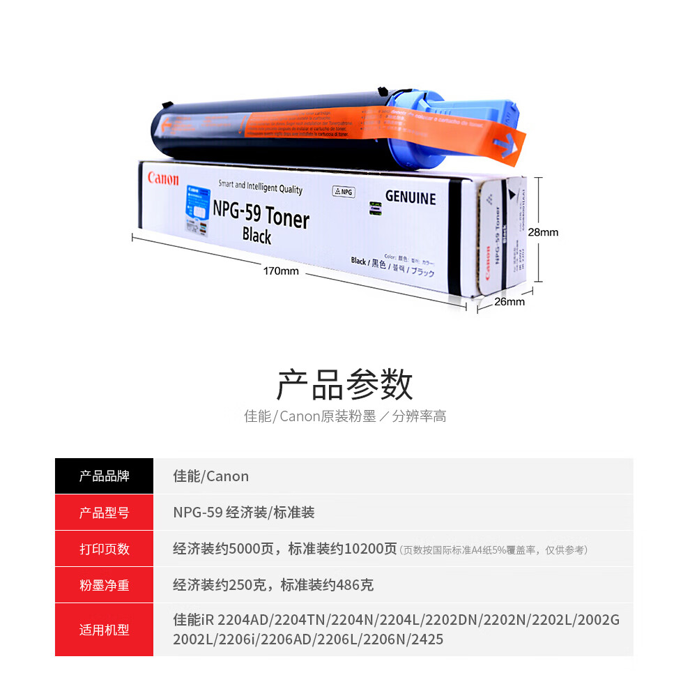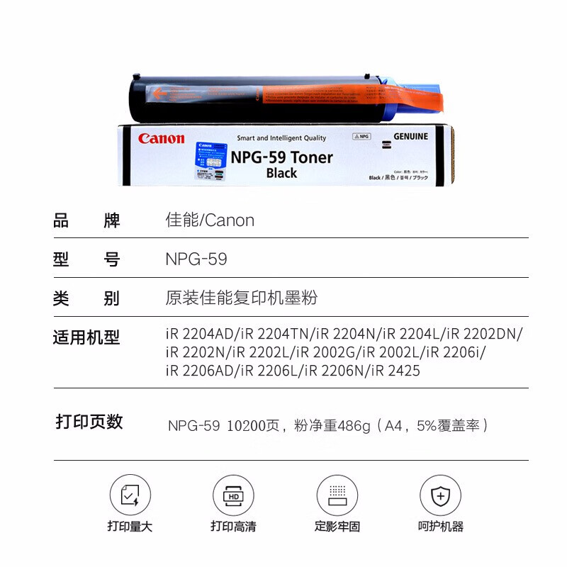 商品名称:佳能(Canon)NPG-59原装墨粉 2206N/L/AD粉盒墨盒2002G/2204N碳粉粉盒 NPG-59 标准装 商品编号:100016432912 品牌:佳能(Canon) 上架时间: 商品毛重:0克