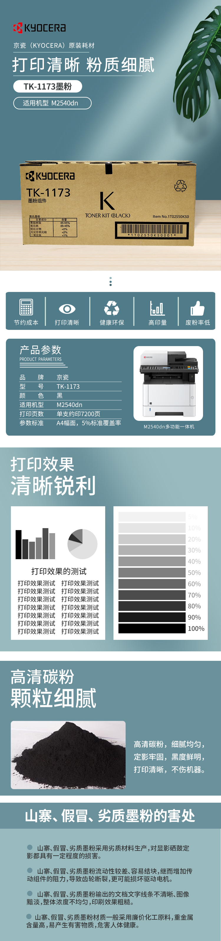 商品名称:京瓷 Kyocera TK-1173墨粉/墨盒 适用于京瓷M2540dn打印一体机 约印7200页 商品编号:100014750814 品牌:京瓷/Kyocera 上架时间: 商品毛重:0克