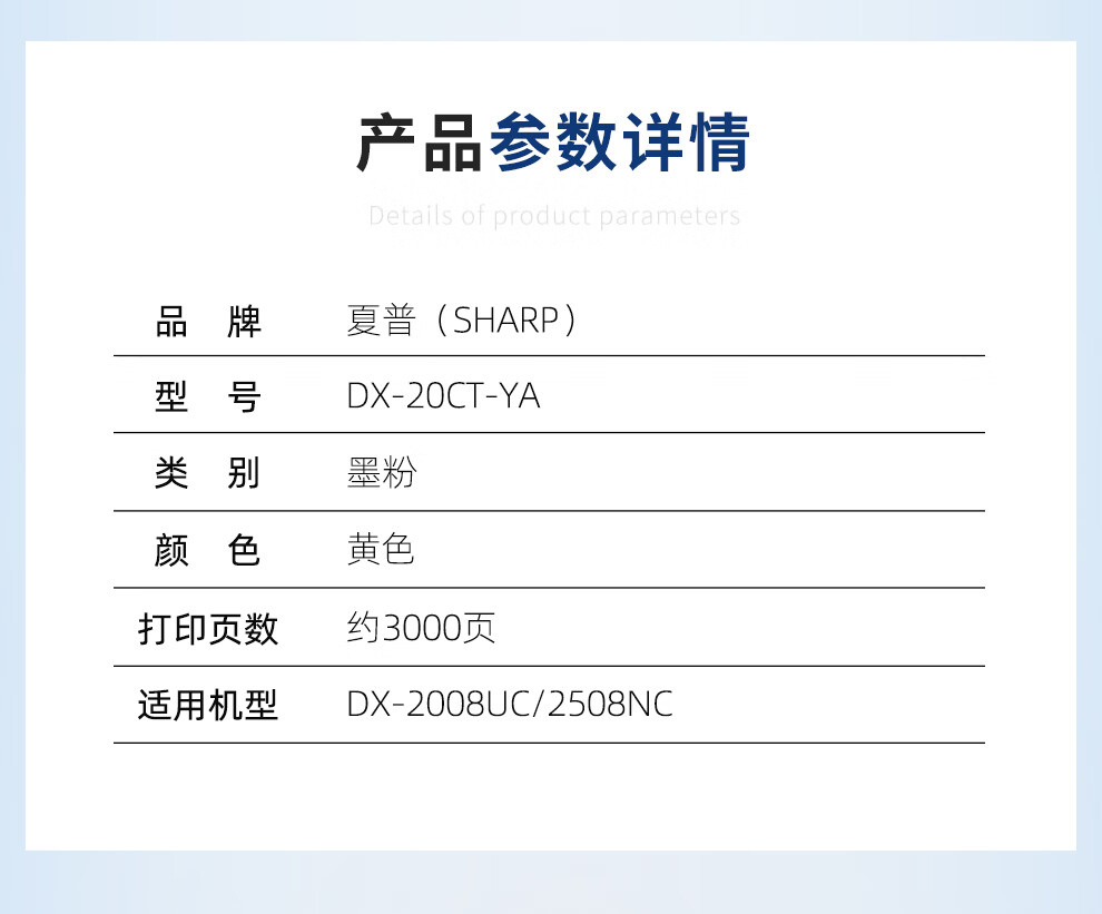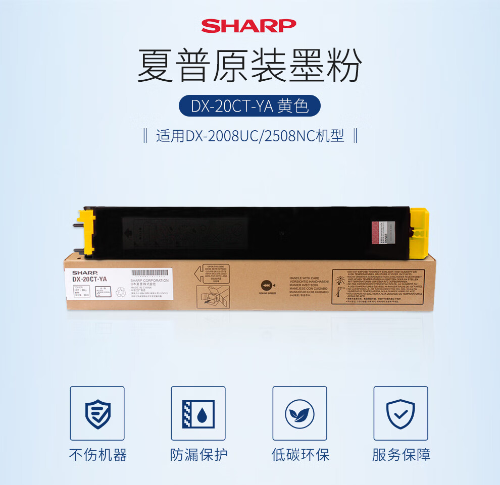商品名称:夏普(SHARP) DX-20CT-YA 原装黄色墨粉 标准容量(适用DX-2008UC/2508NC机型)约3000页 商品编号:100007166080 品牌:夏普/Sharp 上架时间: 商品毛重:0克