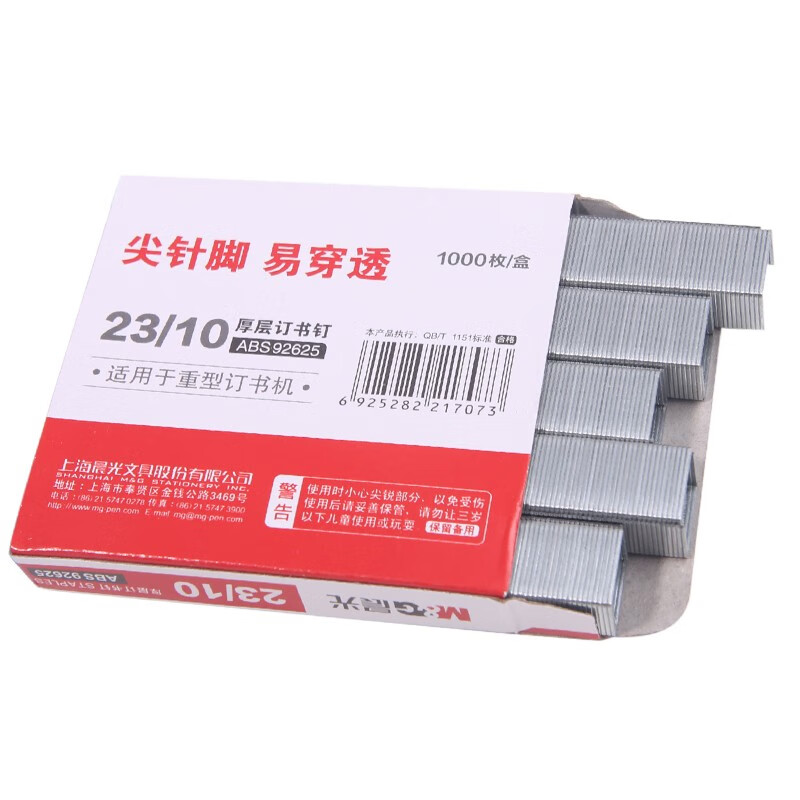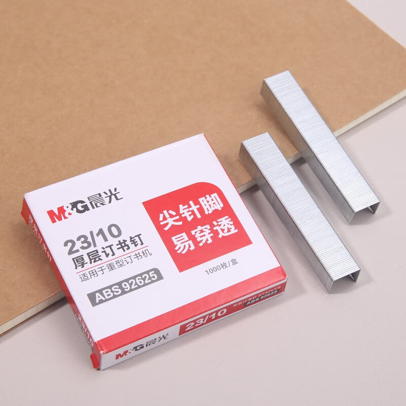 - 商品名称:晨光(M&G)文具23/10号厚层订书钉 尖针脚易穿透订书针 重型订书钉 办公用品 1000枚/盒 5盒装ABS92625