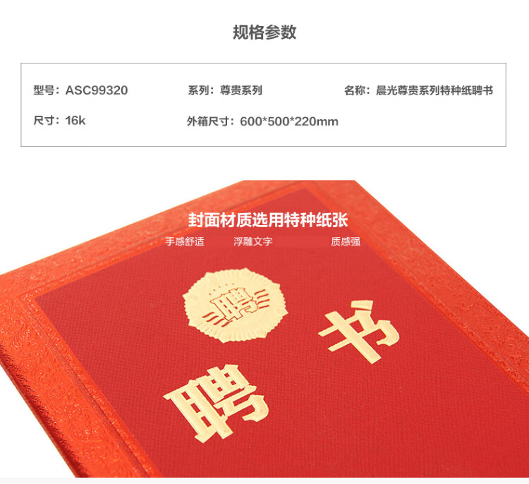 商品名称:晨光10本装尊贵特种纸系列16K聘书ASC99320 商品编号:100013216366 品牌:晨光/M&G 上架时间: 商品毛重:0克