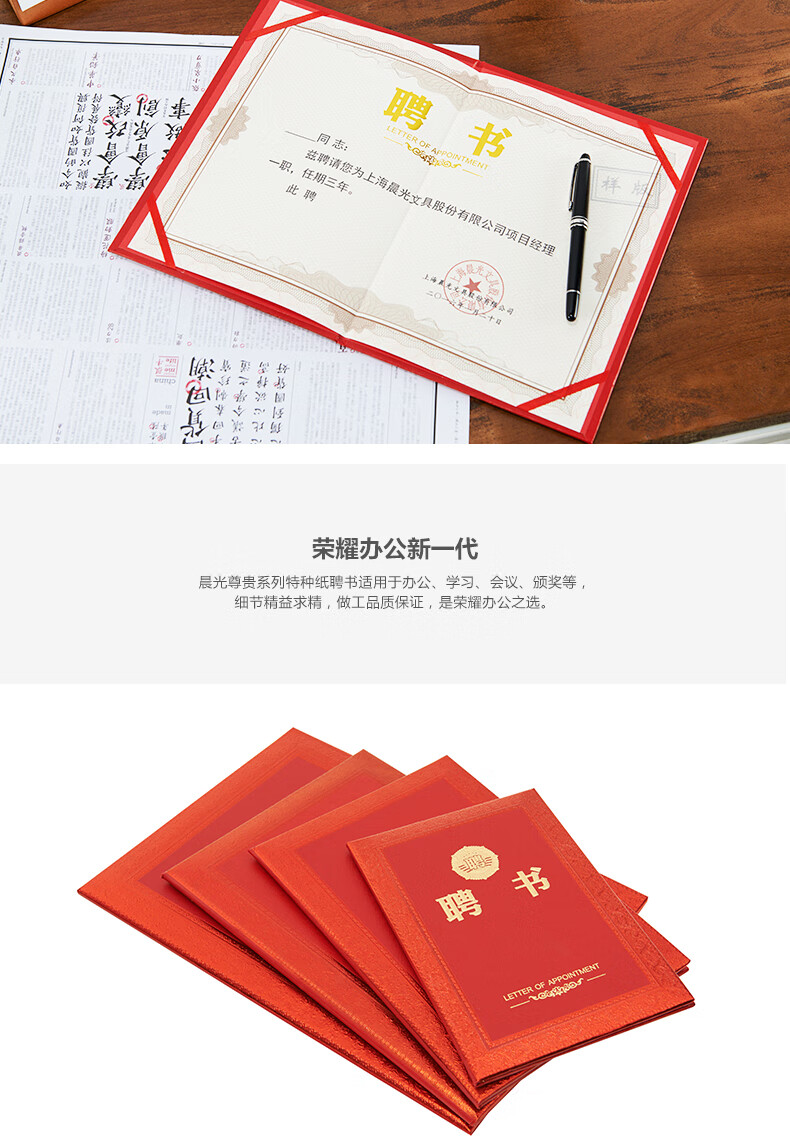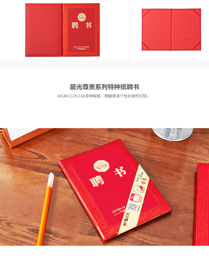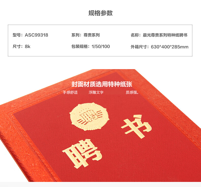 商品名称:晨光(M&G)ASC99318 尊贵特种纸8K聘书(含内芯纸) 5本装 商品编号:100009536603 品牌:晨光/M&G 上架时间: 商品毛重:0克