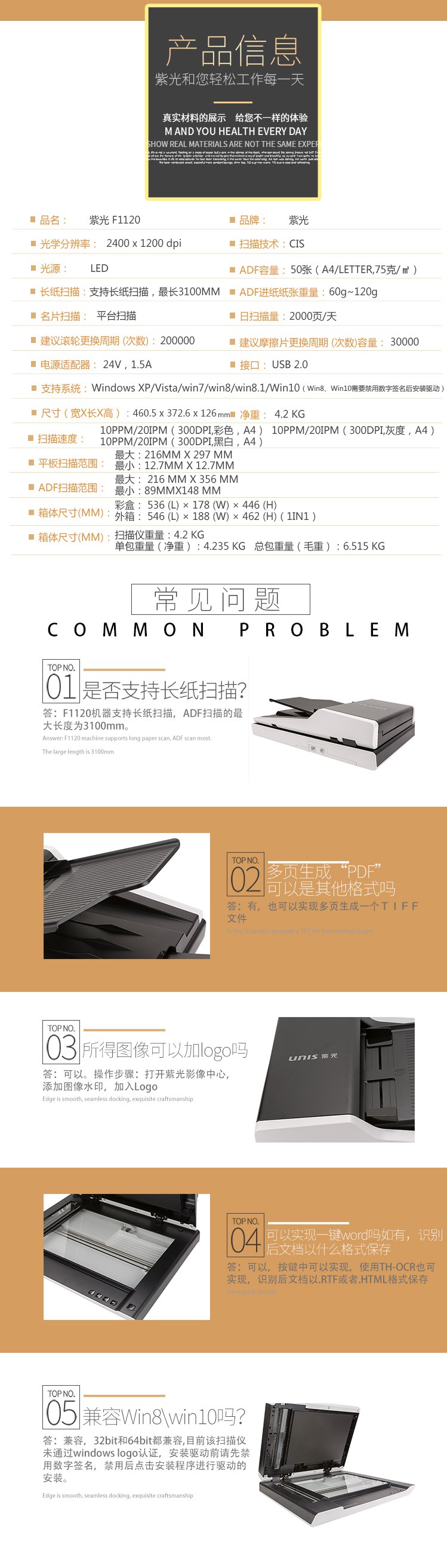 主体特性 所属品牌 紫光 型号 F1120 类别 扫描仪 功能 扫描