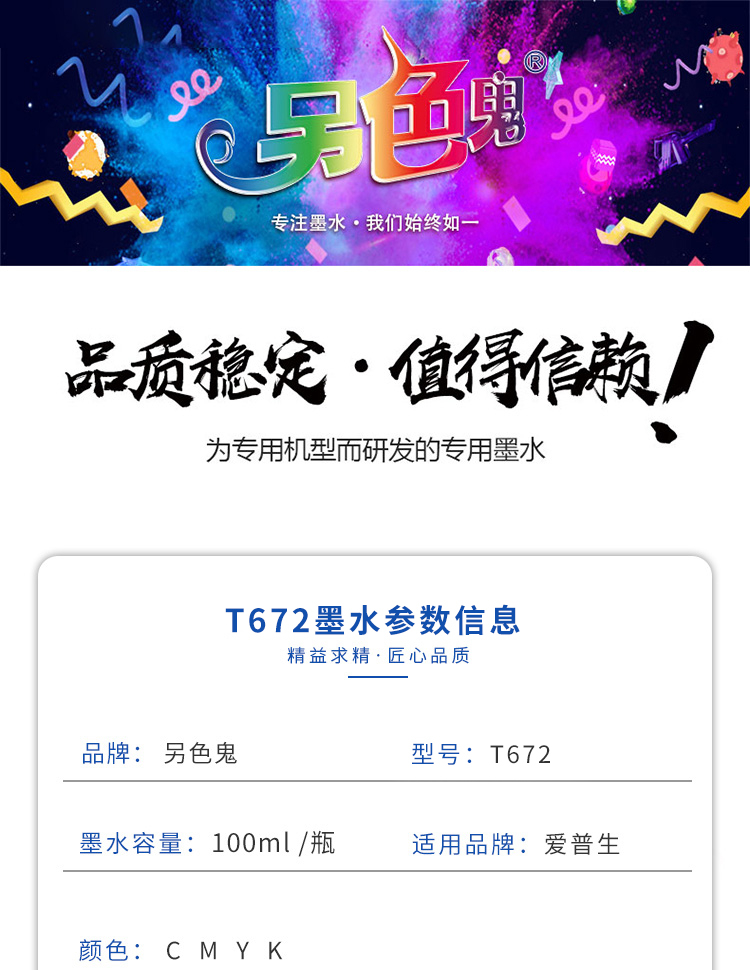商品名称:另色鬼 T672墨水 适用L130 L1300 L310 L383 L101 L551 L565 L211墨仓式打印机墨水 黄色100ML 商品编号:100017733739 品牌:另色鬼 上架时间: 商品毛重:0克