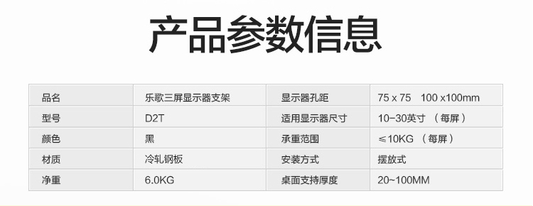 商品名称:乐歌(Loctek)D2T 显示器支架三屏电脑显示器支架 多屏拼接架旋转支架 商品编号:2683405 品牌:乐歌/Loctek 上架时间: 商品毛重:0克