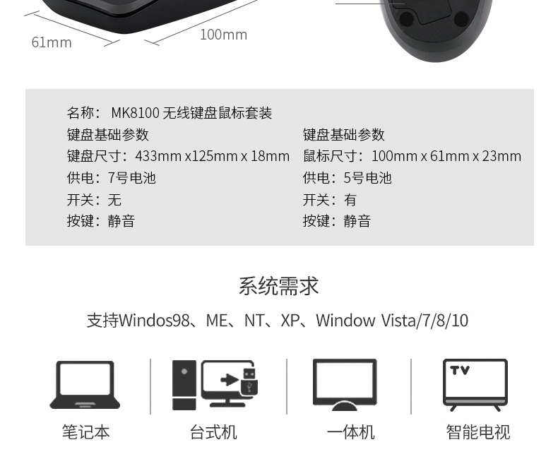 商品名称:迪摩 DEARMO MK8100无线键盘鼠标套装无线键鼠套装商务办公家用笔记本电脑键鼠套装 白色 1200DPI 商品编号:100004611203 品牌:迪摩 上架时间: 商品毛重:700.000千克
