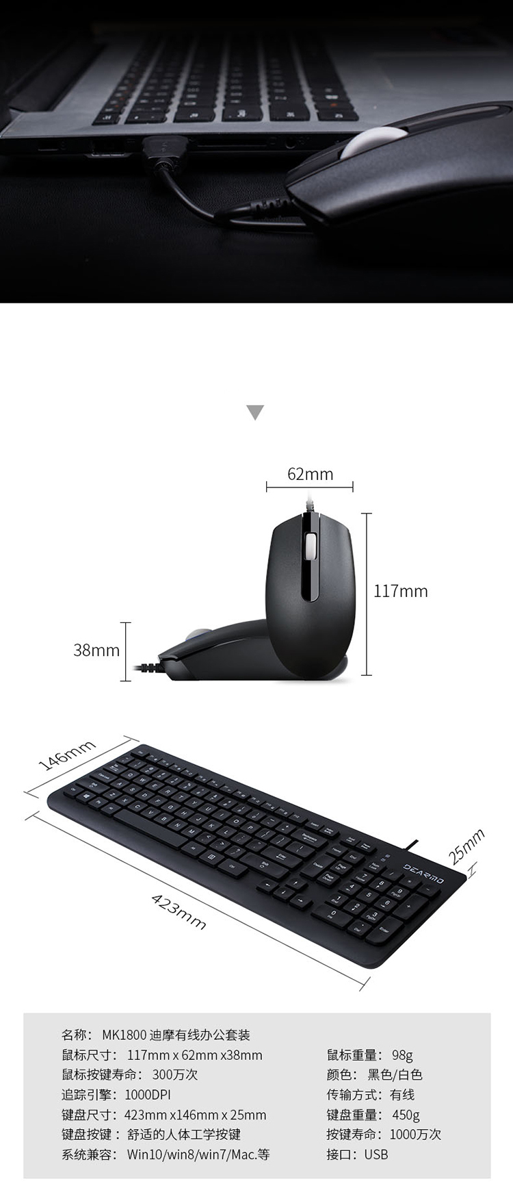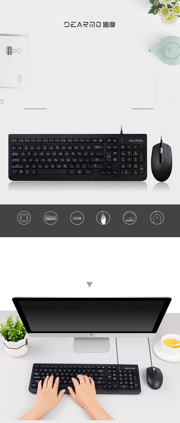 商品名称:迪摩 DEARMO MK1800有线键鼠套装超薄键鼠套装办公家用键鼠套装笔记本电脑键鼠套装 黑色 1000DPI 商品编号:100006814530 品牌:迪摩 上架时间: 商品毛重:450.000千克