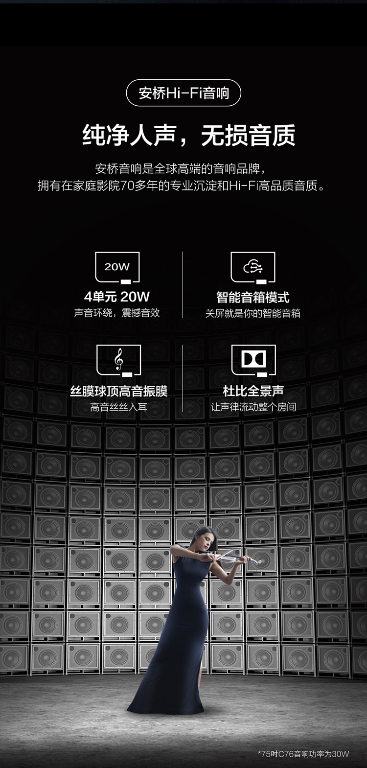 商品名称:TCL 75C76 75英寸4K 高清 高色域 安桥音响 多屏互动 全面屏 全场景语音电视 商品编号:10034210843308 品牌:TCL 上架时间: 商品毛重:31.900千克