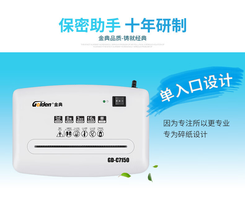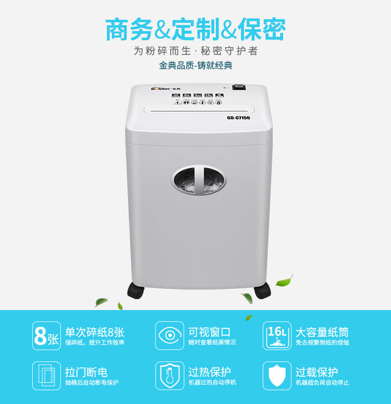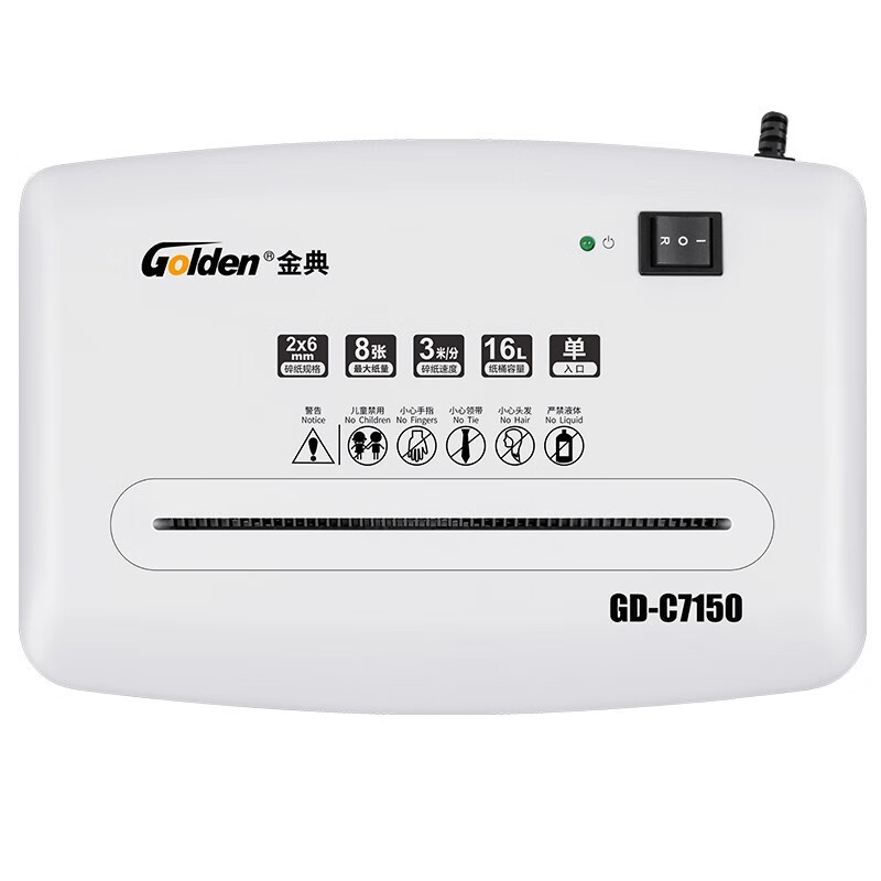 商品名称:金典 GOLDEN GD-C7150碎纸机 商务粉碎机 商品编号:100016139913 品牌:金典 上架时间: 商品毛重:9.500千克