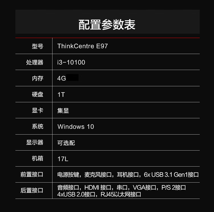 商品名称:联想(ThinkCentre)E97商用办公台式电脑 i3-10100/4G/1T机械/无驱/集成/Win10/21.5英寸显示器/可支持win7 商品编号:100012919335 品牌:联想/LENOVO 上架时间: 商品毛重:0克