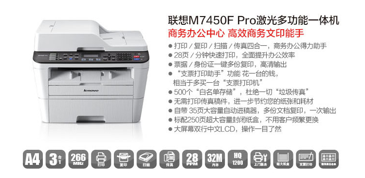 商品名称:联想(Lenovo)M7450F Pro 黑白激光多功能一体机打印复印扫描传真商用办公多页输稿器 商品编号:100029672270 品牌:联想/LENOVO 上架时间: 商品毛重:7.000千克