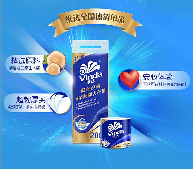 - 商品名称:维达(Vinda)蓝色经典卷纸4层200克 家用有芯卷筒纸巾厕纸卫生纸手纸