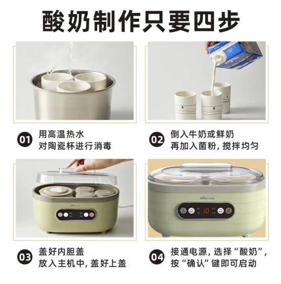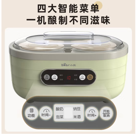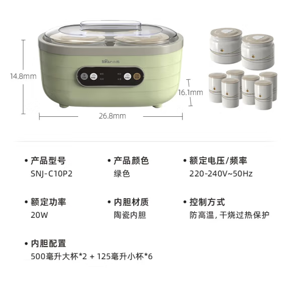 商品名称:小熊(Bear)酸奶机 家用全自动大容量分杯米酒机酸奶发酵菌纳豆泡菜机SNJ-C10P2(浅绿) 商品编号:103849 品牌:小熊/Bear 上架时间:2022-07-04 商品毛重:0克