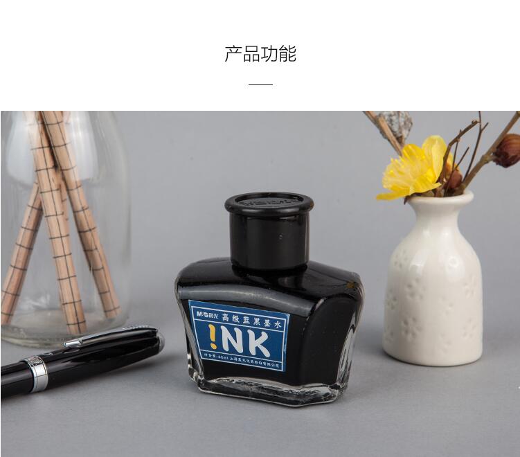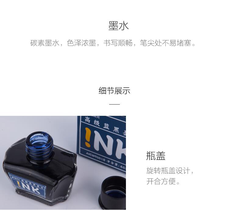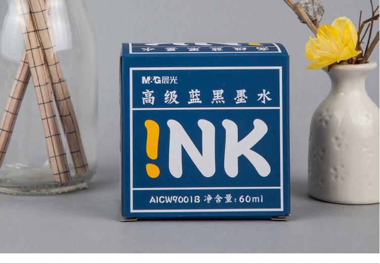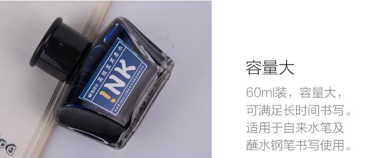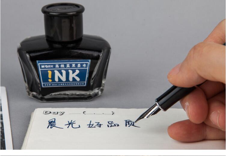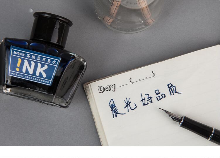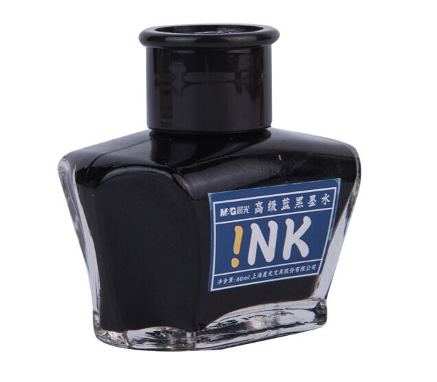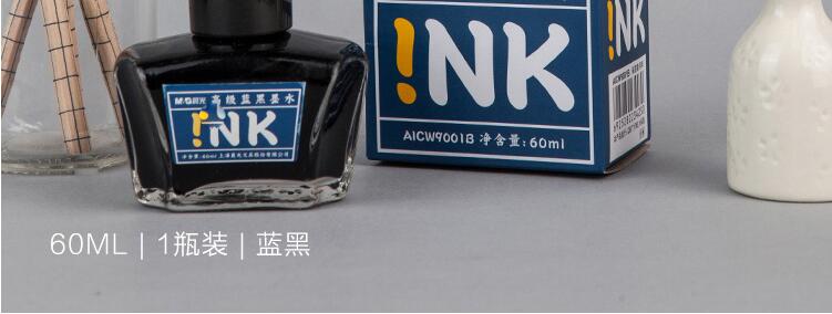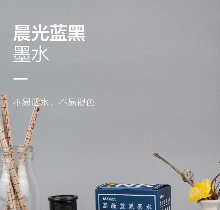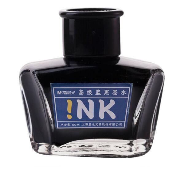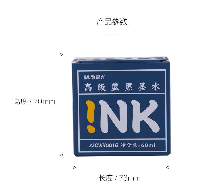 商品名称:晨光(M&G)蓝黑色高级碳素墨水不堵钢笔水大容量60ml/瓶 AICW9001B 商品编号:096405 品牌:晨光/M&G 上架时间:2019-07-05 商品毛重:180克