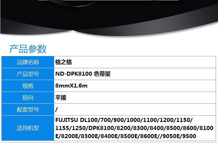 商品名称:格之格DPK8100色带适用富士通DPK8100 8200 8300 8400 8500 8600打印机色带架 商品编号:096574 品牌:格之格/G&G 上架时间:2019-07-09 商品毛重:40克