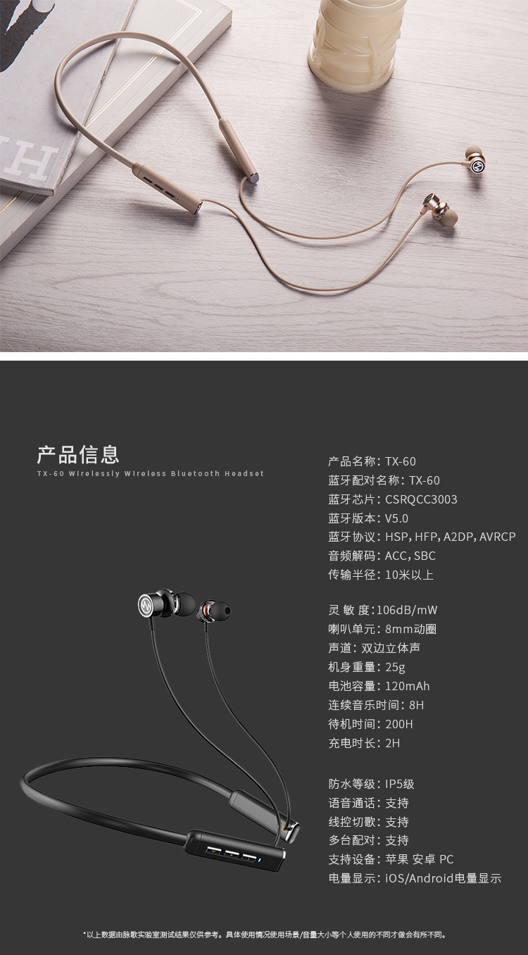 主体 类别 耳机 型号 TX-60 名称 脉歌(Macaw)TX-60 无线蓝牙耳机