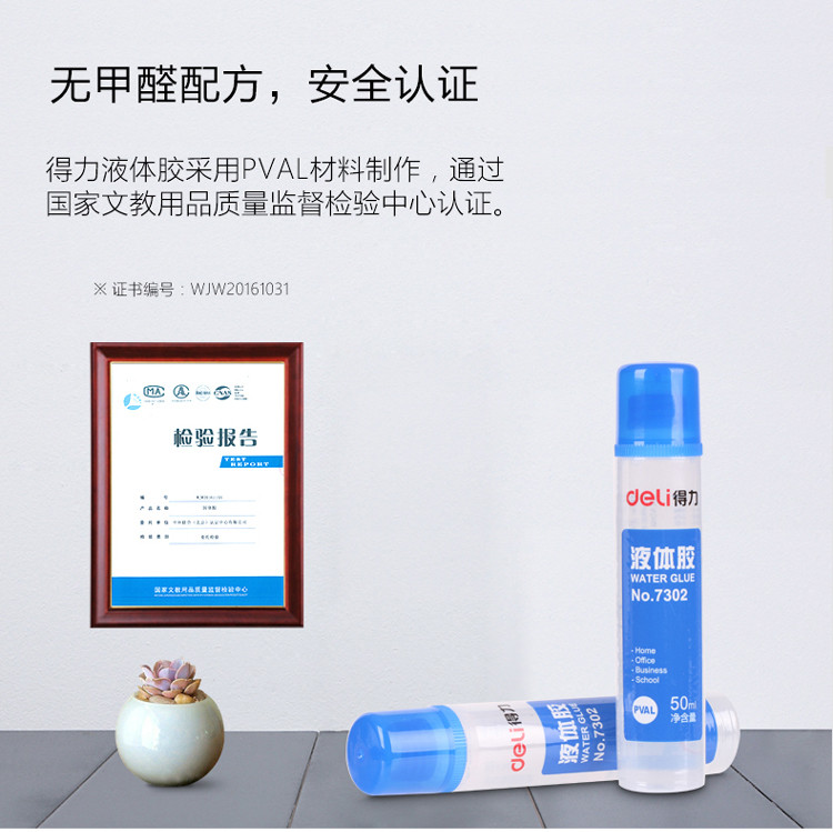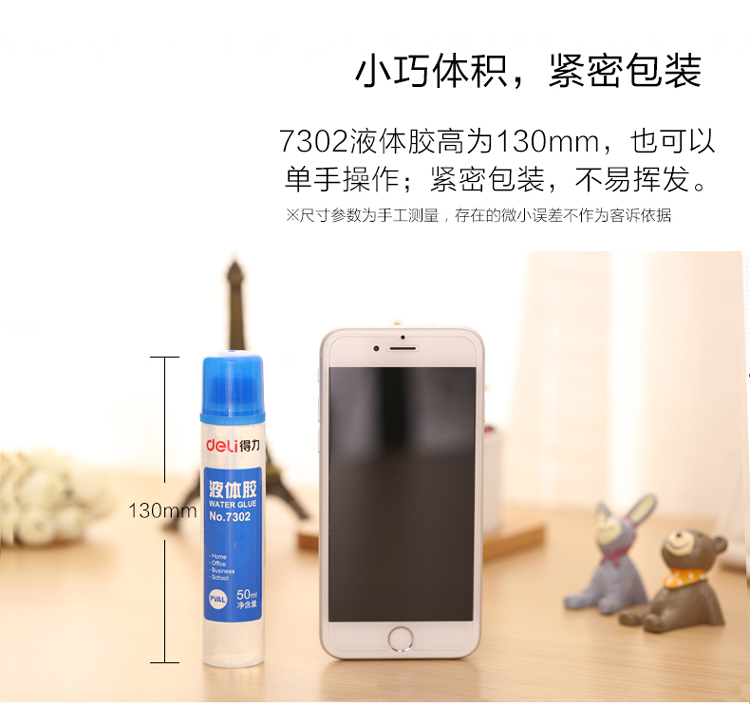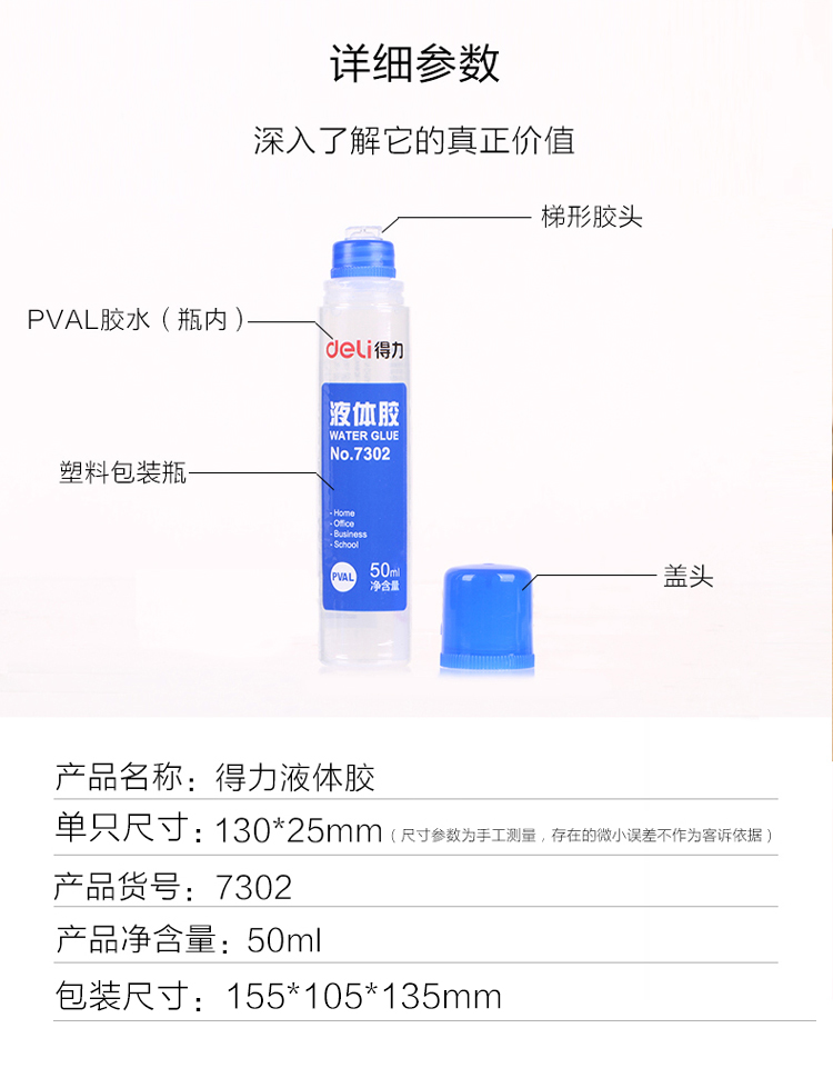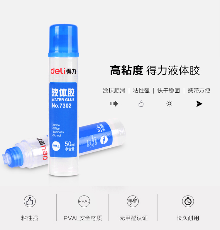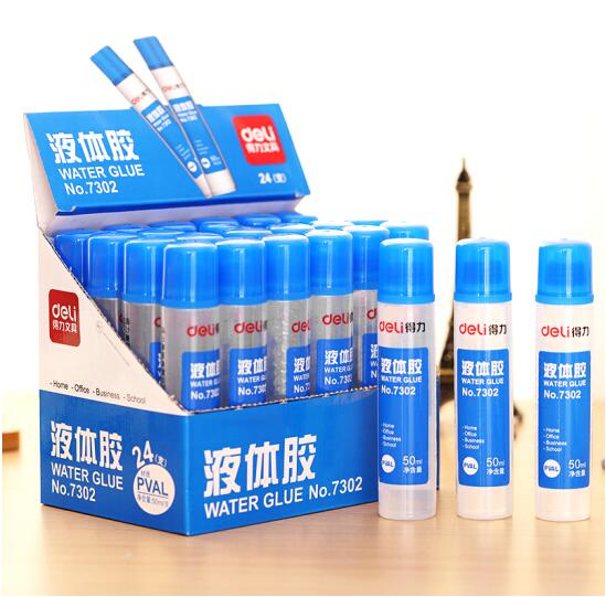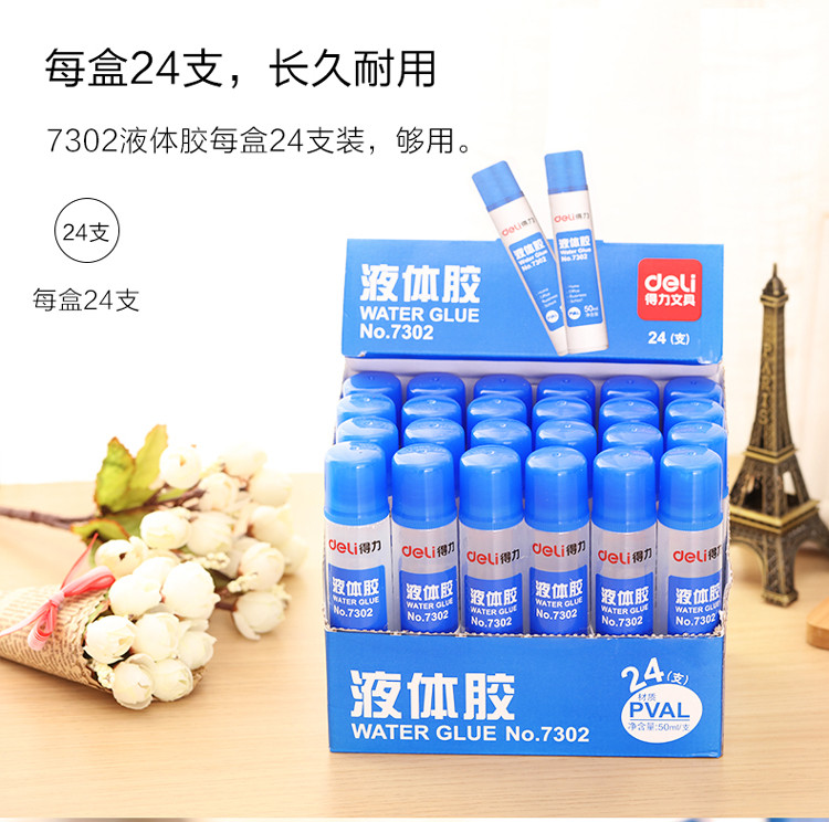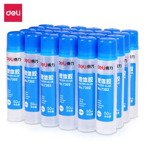 商品名称:得力(deli)50ml高粘度液体胶 学习办公通用胶水 24只装 办公用品 7302 商品编号:096720 品牌:得力/deli 上架时间:2019-08-02 商品毛重:70克