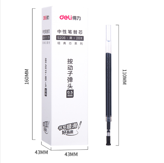- 商品名称:得力S206,0.5mm按动笔芯 中性笔芯S01配套黑红蓝色替芯弹簧头按动水笔芯 20支/盒